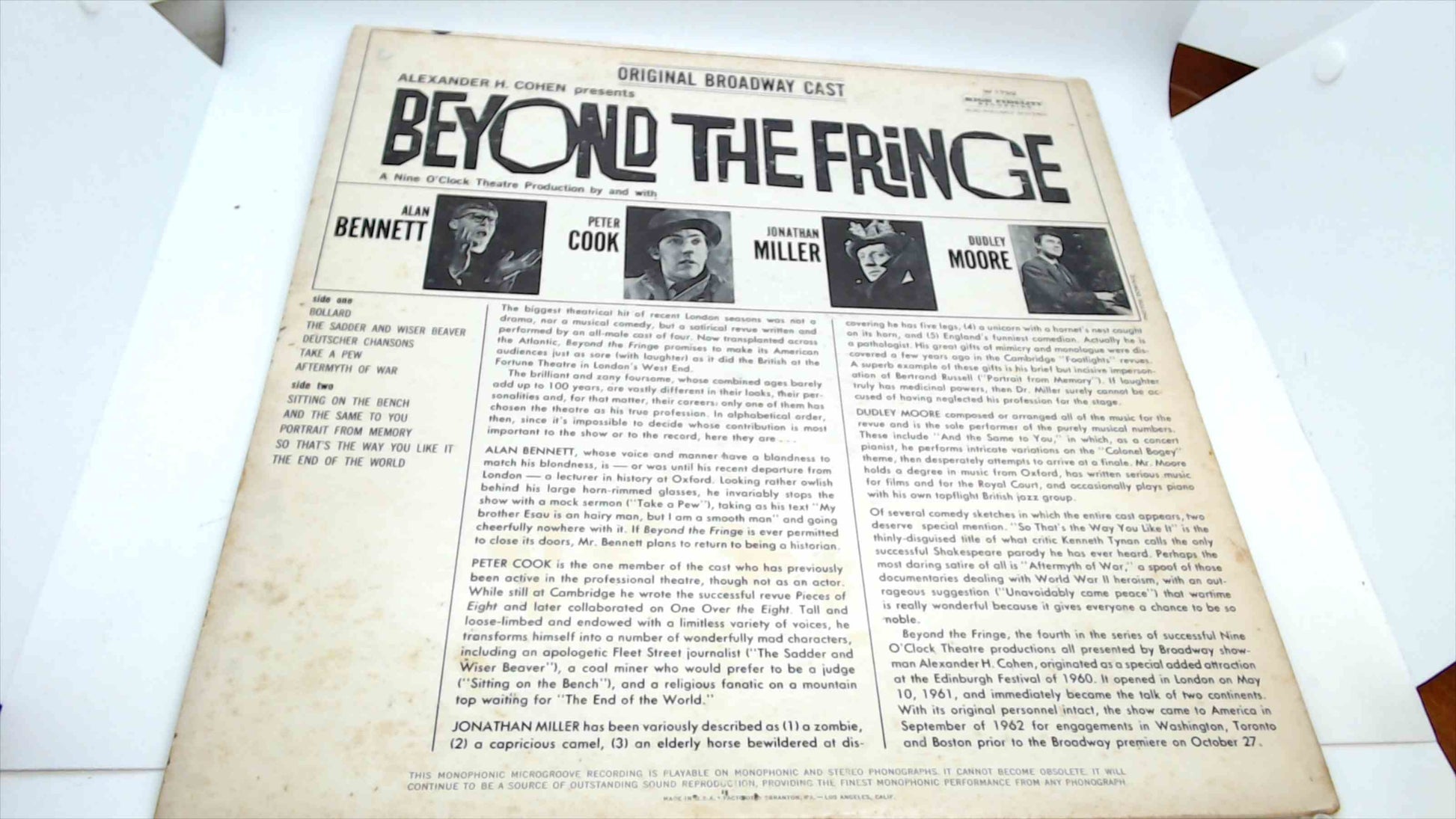 Experience the original satire that changed comedy forever! This 1962 Capitol Records LP features the full cast recording of Beyond The Fringe, the groundbreaking British comedy revue starring Alan Bennett, Peter Cook, Jonathan Miller, and Dudley Moore.