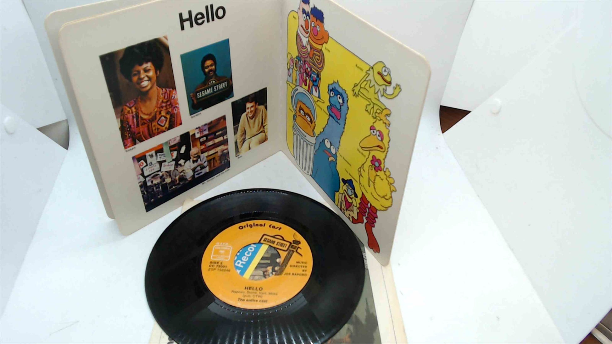 Includes the small gatefold book with photos and the matching 7" 45 RPM record: Side 1 “Sesame Street,” Side 2 “Hello.”