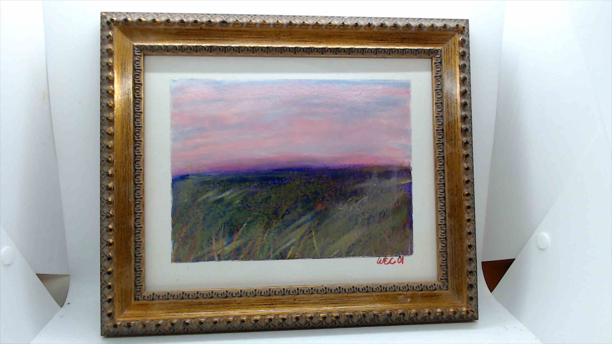 This is a beautiful original oil painting titled “5:00 AM on the Plains” by artist Wynn Creasy, signed and dated 2001. The piece captures a serene, misty sunrise over rolling plains in vibrant shades of pink, lavender, and green. It’s painted on Masonite and comes professionally framed in a textured antique gold wood frame with a hanging wire on the back.