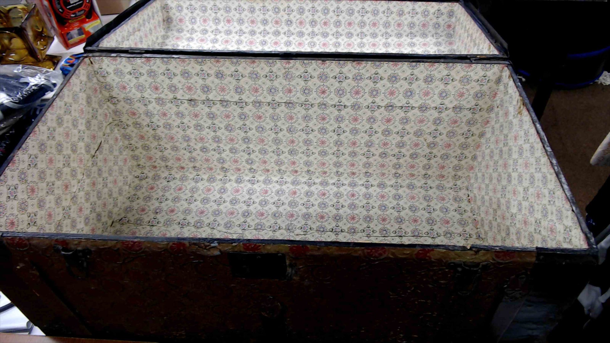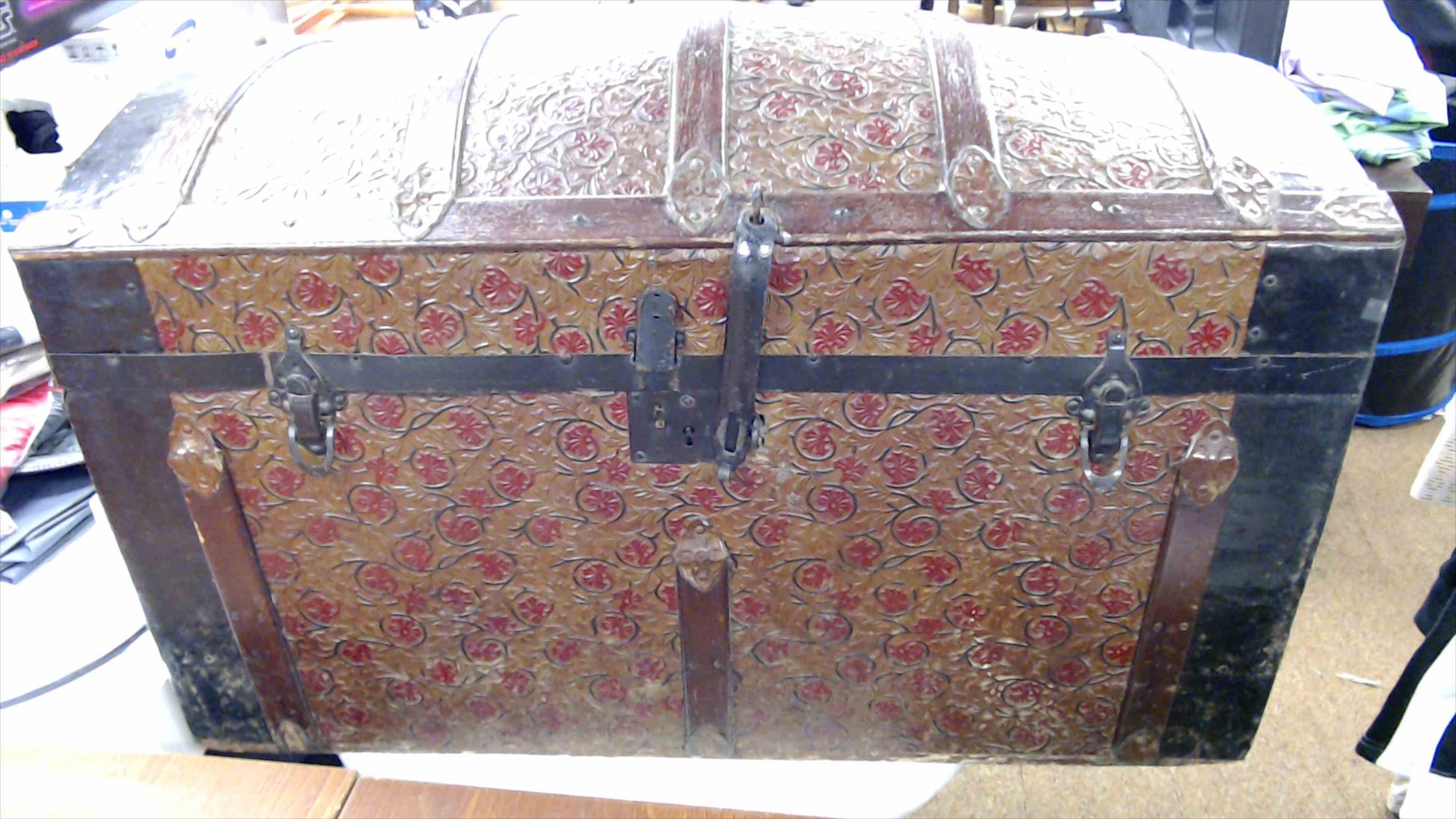 Antique Dome-Top Steamer Trunk – Embossed Floral Design – 32”x17”x19”