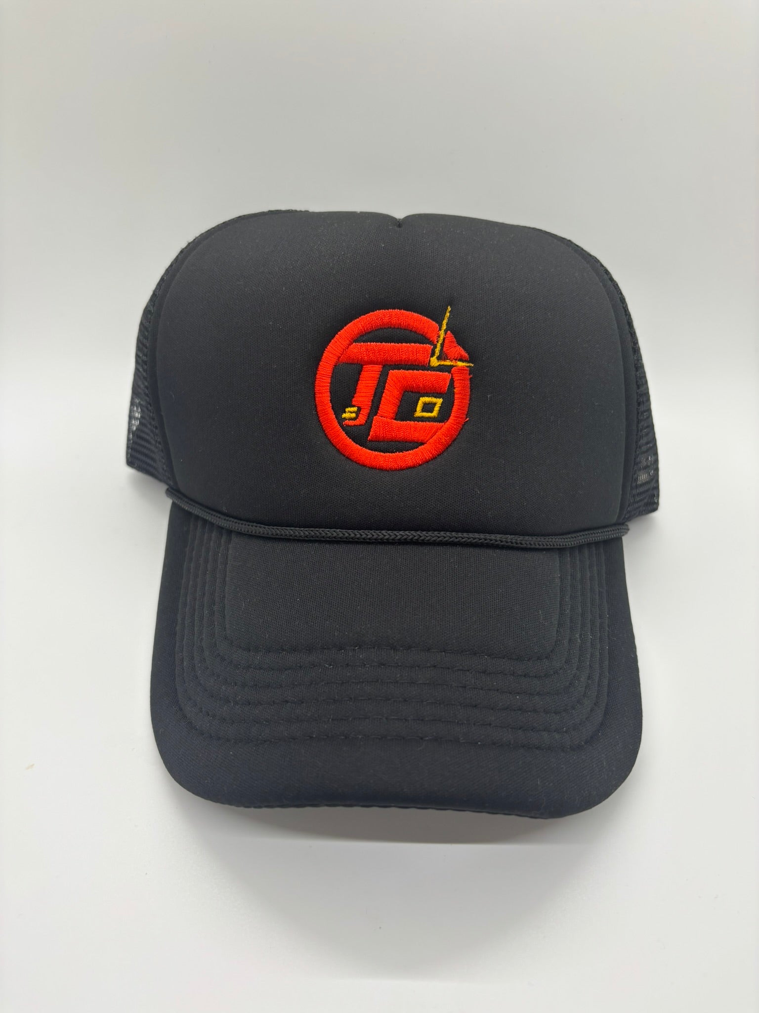 Black Trucker Hat featuring a bold red and yellow embroidered JD logo. Designed with a structured foam front and breathable mesh back, this cap is perfect for everyday wear, outdoor adventures, or repping your favorite brand with attitude. The snapback closure ensures a perfect fit for most head sizes.