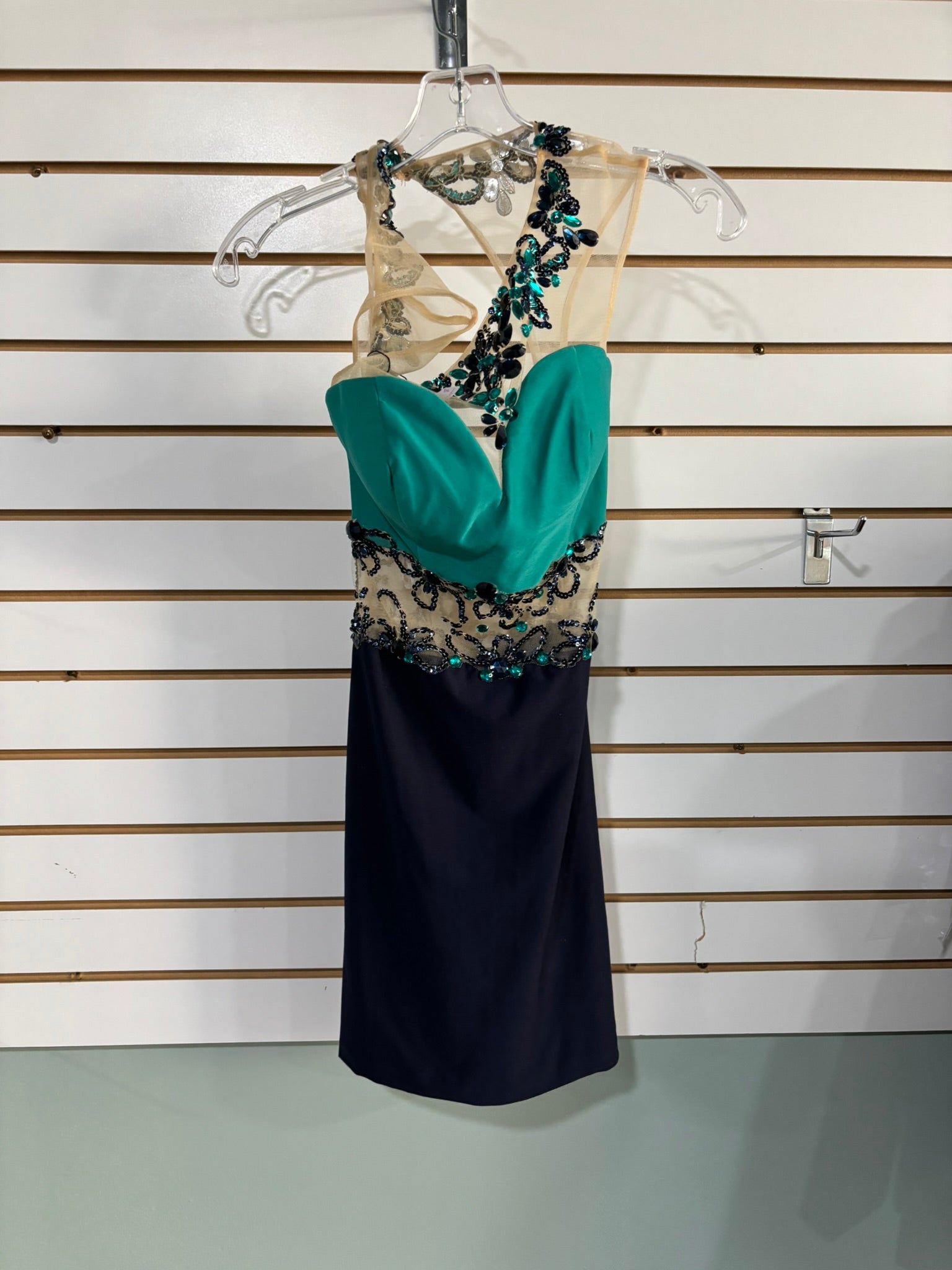 Elegant Teal & Black Illusion Cocktail Dress with Sequin Embellishments
