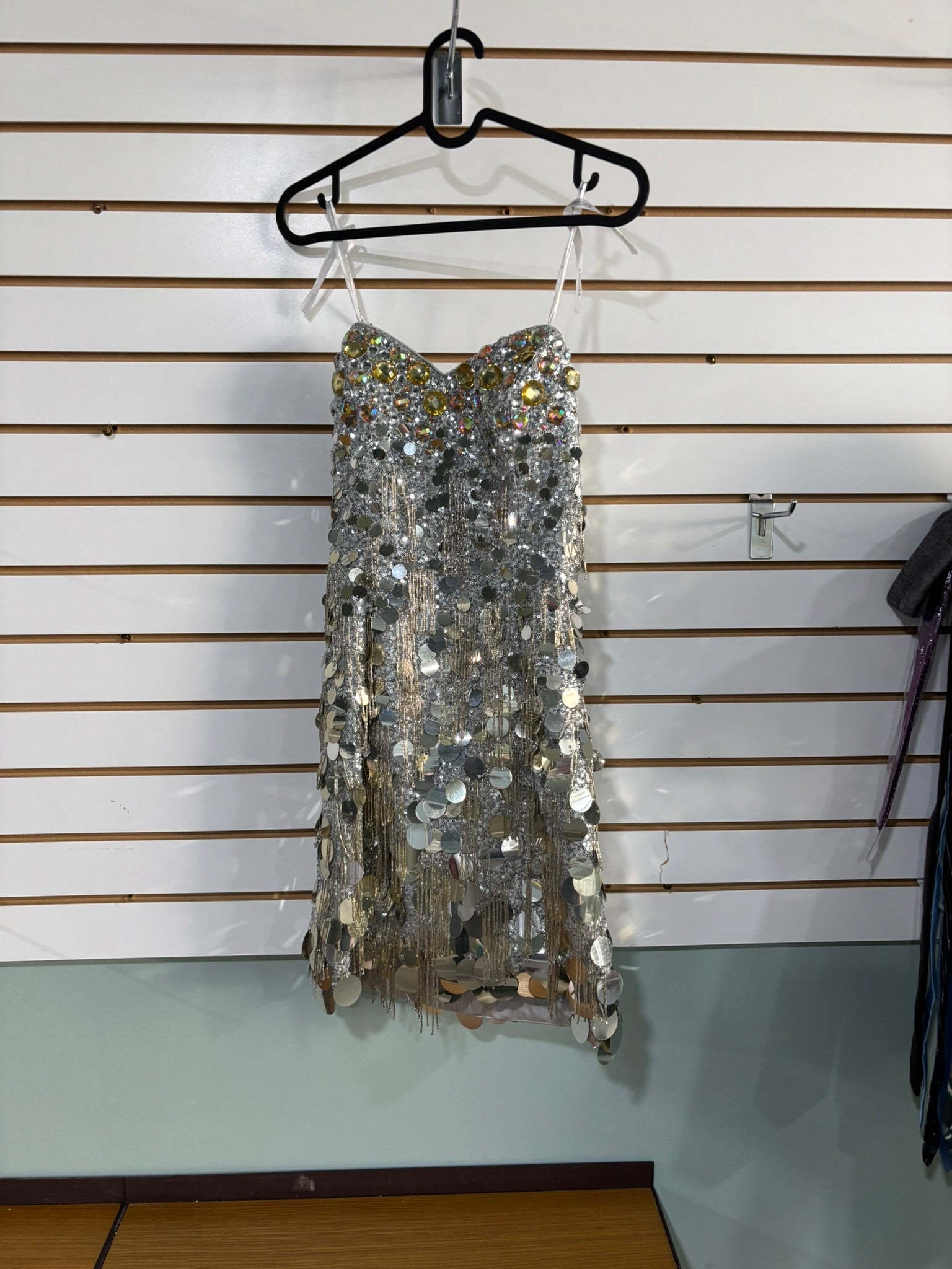 Turn heads with this dazzling Glam Sequin Fringe Party Dress, designed to light up the room with every step. This eye-catching mini dress features a fitted bodice adorned with multi-sized silver and gold rhinestones and sequins, transitioning into a cascade of shimmering fringe and large disc sequins. Perfect for New Year’s Eve, nightclubs, dance performances, or any celebration where you want to sparkle.