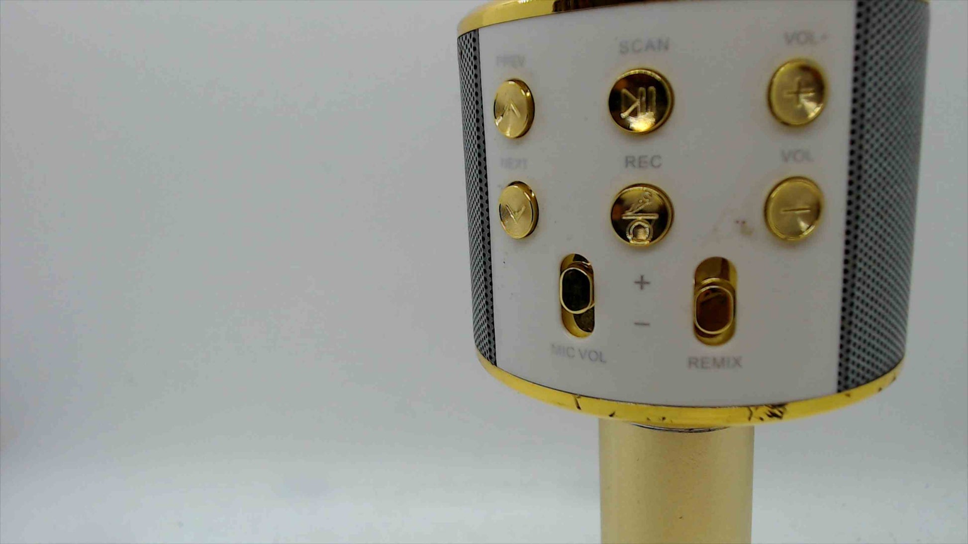 Fun handheld karaoke mic with an integrated speaker. Connect by Bluetooth or AUX and sing anywhere. Control panel includes Prev/Next, Play/Pause/Scan, Record, volume, mic volume and remix/echo. Ports: 5V charge, TF (microSD), USB, and 3.5mm audio out. Camp Invention branded. Pre-owned with cosmetic wear/scuffs on the gold trim and grille (see photos). No cables or accessories included.