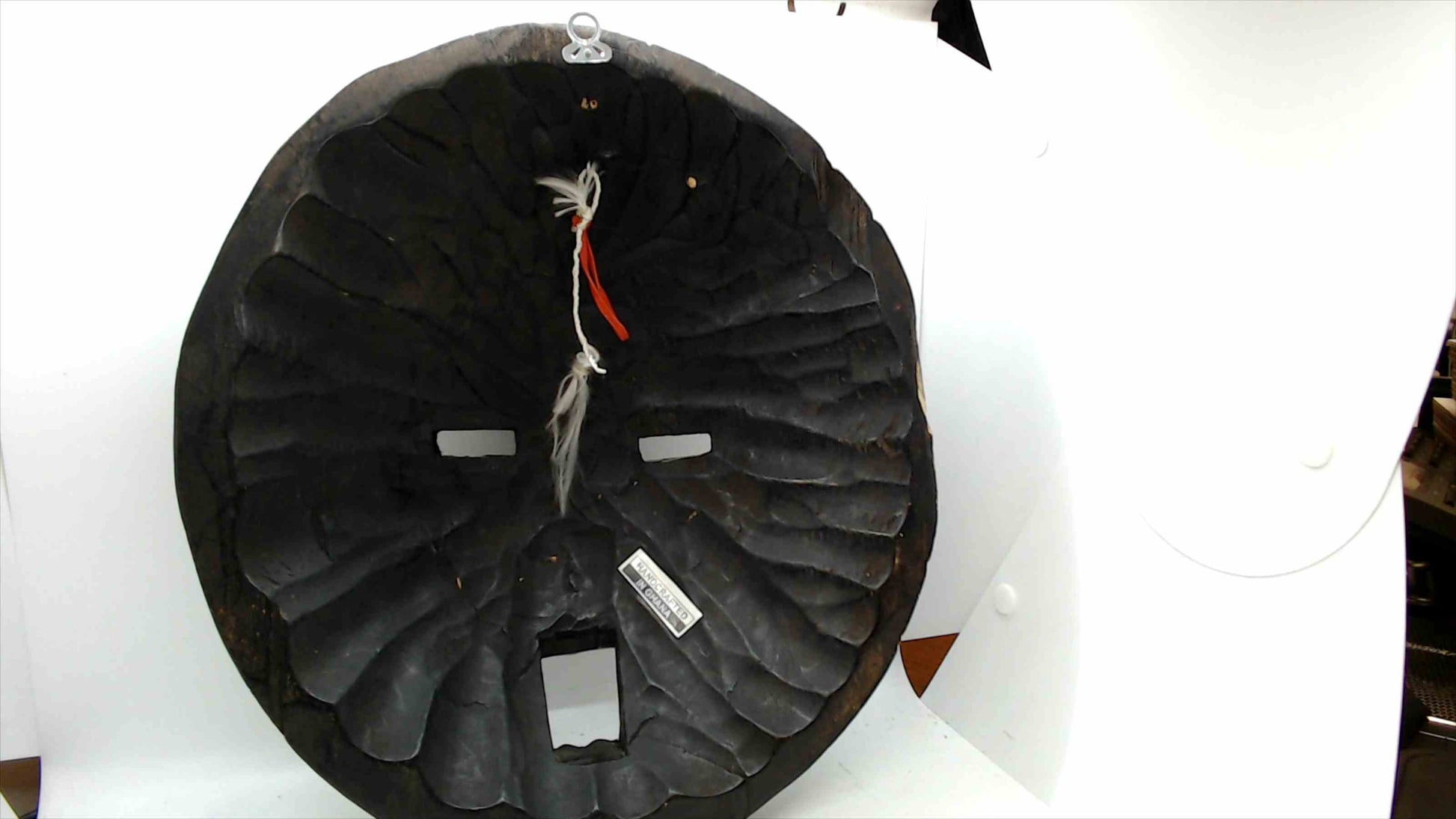 Authentic handcrafted wooden mask from Ghana, featuring a striking round shape with intricate hand-carved patterns and cut-out eyes and mouth. The mask is finished in a deep black tone with natural wood highlights, showcasing traditional Ghanaian craftsmanship. Back includes a hanging ring for easy wall display. Perfect as African décor, a collector’s piece, or a cultural accent in any space.