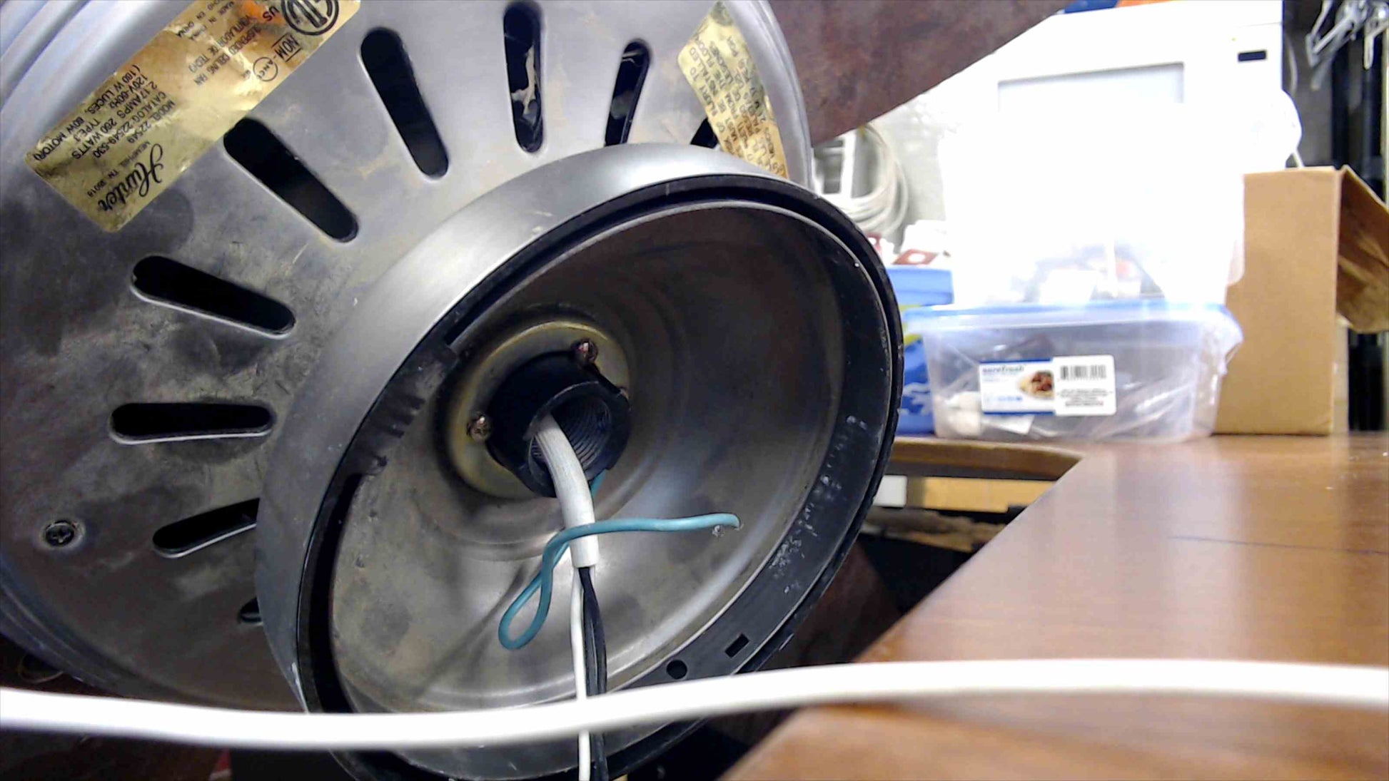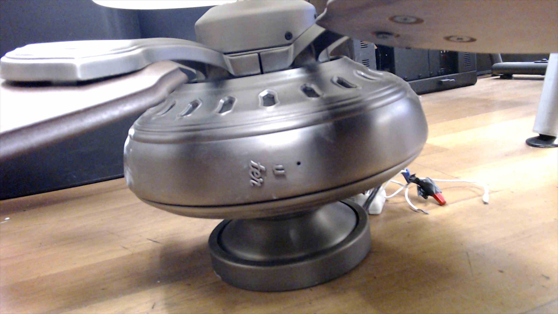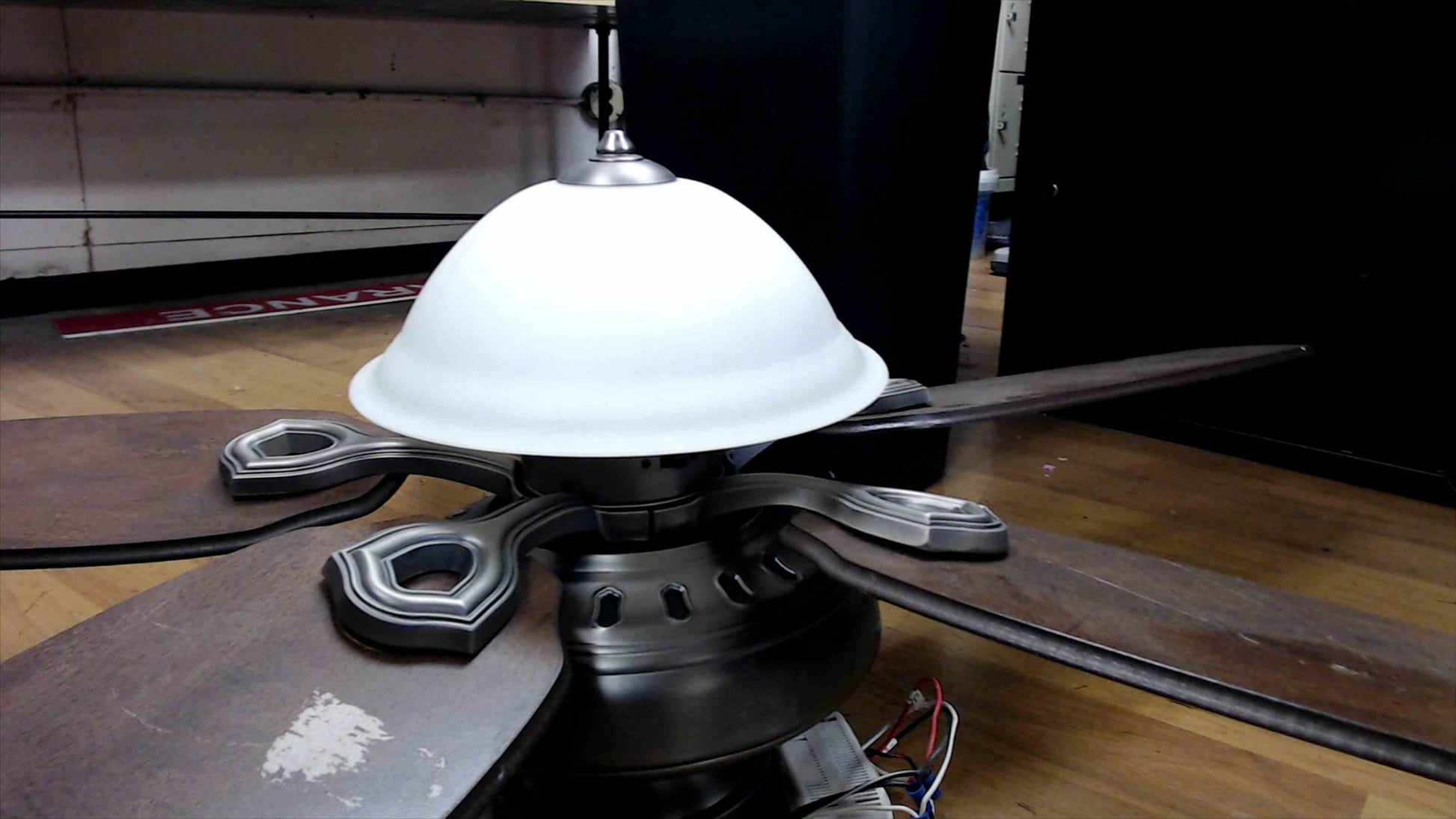 Classic Hunter 5-blade ceiling fan in a brushed nickel/pewter finish with dark wood blades and a frosted dome light kit. Plugged in and tested—motor and light both work. Cosmetically used: blades show scuffs/scratches and one blade has a noticeable mark (see photos). Includes the fan body, 5 blades, frosted glass shade, and in-line receiver module shown. Mounting hardware/downrod/canopy or remote handset not included—comes exactly as pictured. Standard 120V hard-wire install.
