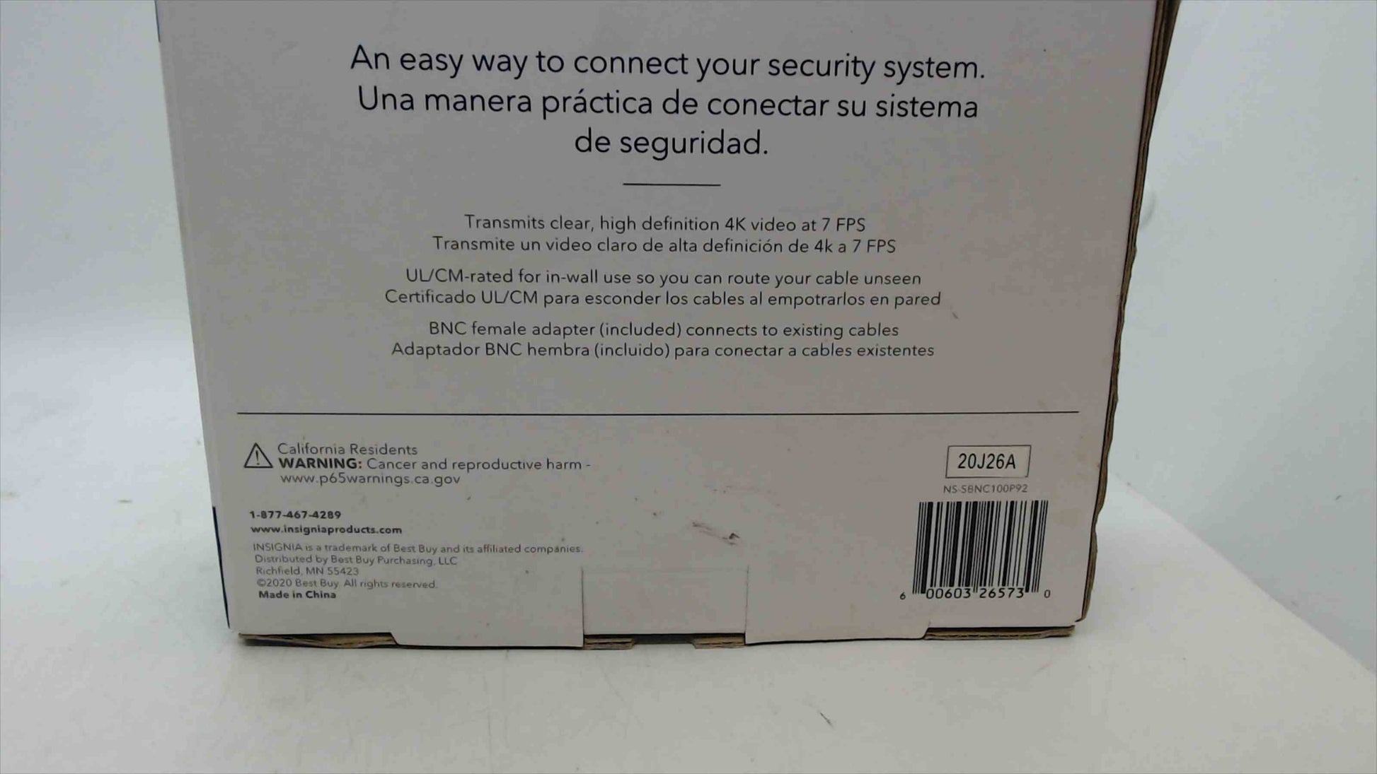 Extend an analog security camera run with this Insignia cable (model NS-SBNC100P2). 100-ft combined coax video (BNC) and 2.1mm DC power, UL/CM in-wall rated, supports up to 4K video at 7 FPS, and includes a BNC female coupler for joining to an existing line. Compatible with most analog monitoring/DVR systems. Box shows light shelf wear; contents unused.