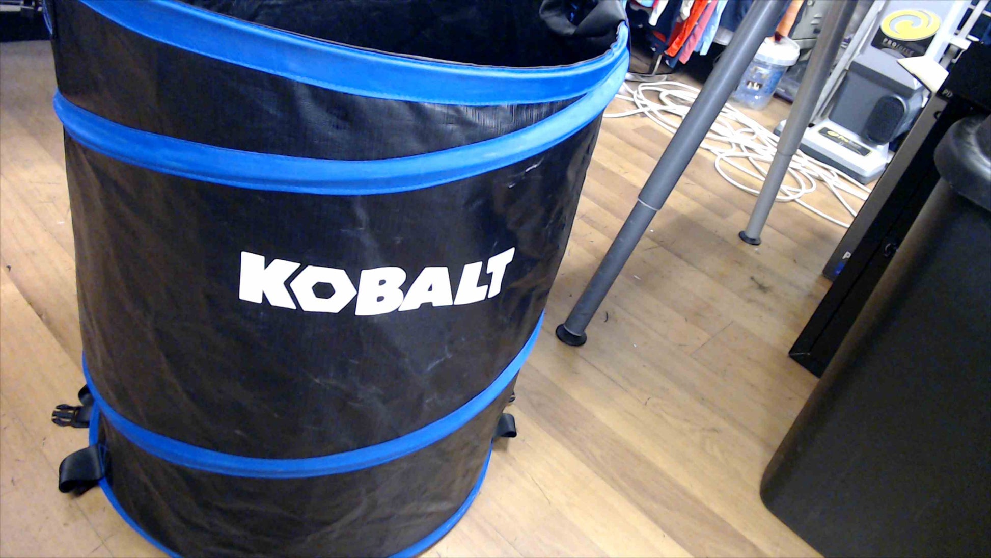 Heavy-duty Kobalt pop-up garden bag with spring frame and durable fabric. Stands open for easy loading; collapses flat with clip straps for compact storage. Reinforced carry handles on the sides and a bottom handle for dumping. Clean and fully functional with typical scuffs and light soil from normal use (see photos). Roughly large / ~2 ft tall when open.