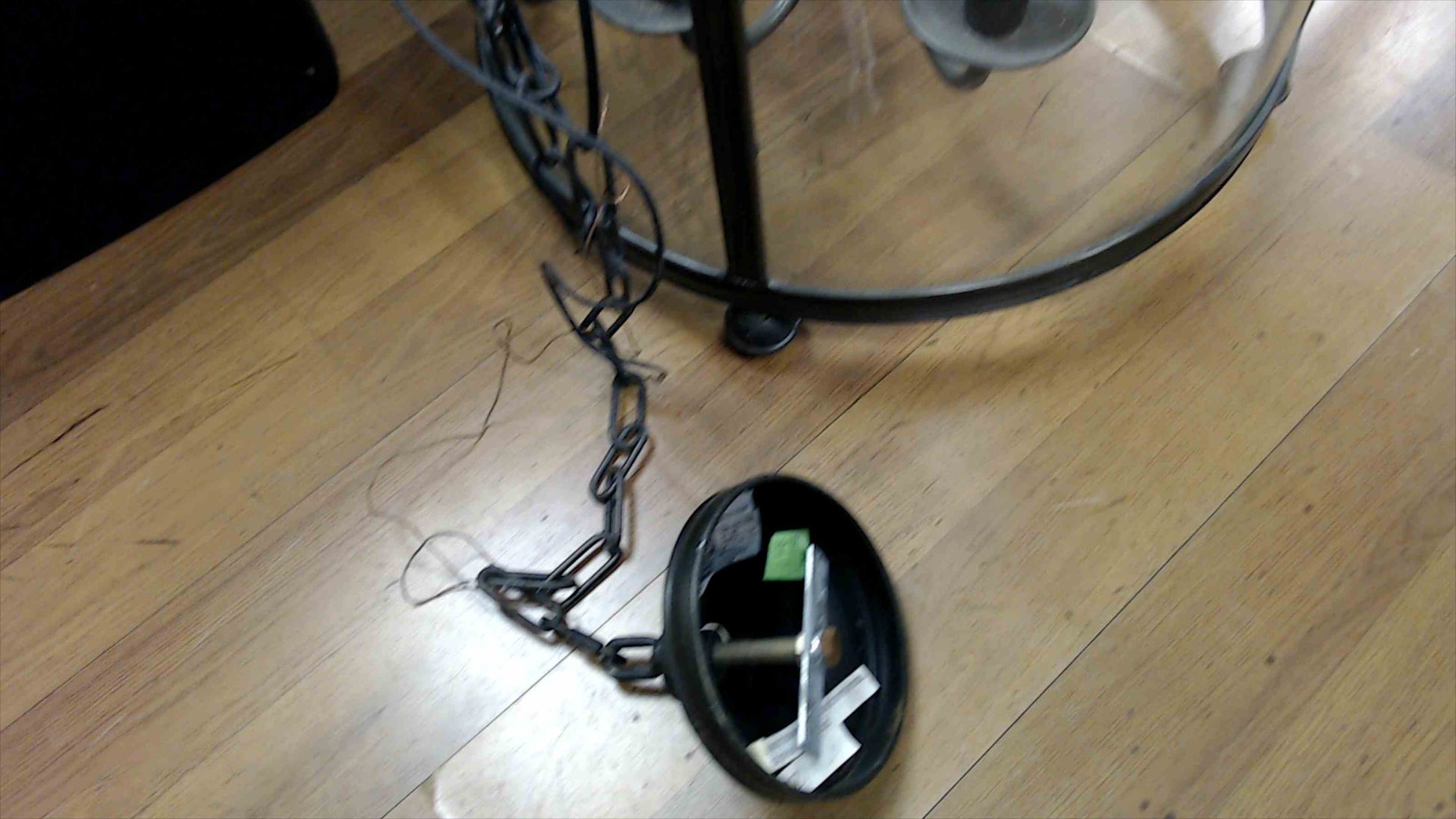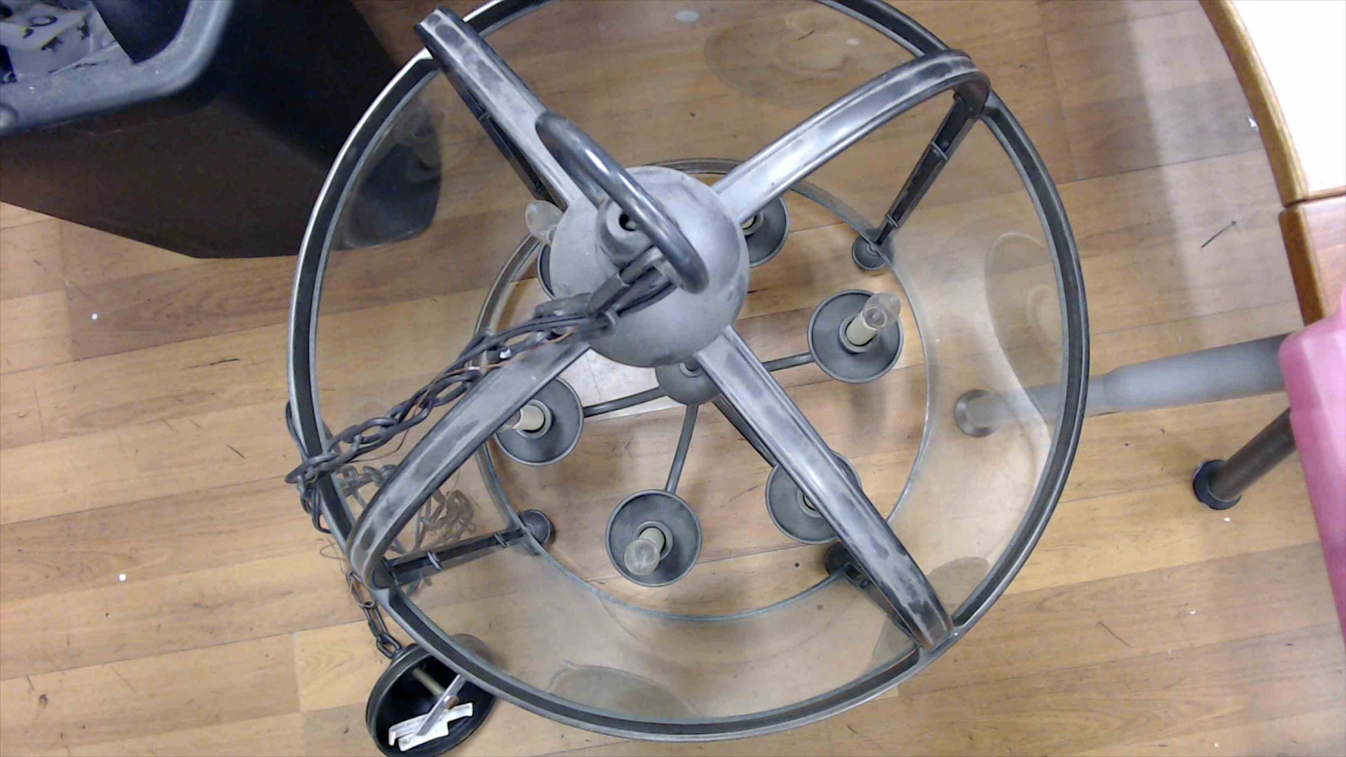 Elegant hanging chandelier with a round drum of curved clear glass panels and a brushed pewter/antique gray frame. Six candelabra sockets inside (E12) give lots of light. Hardwired; includes matching canopy and heavy chain as shown. Tested—lights up properly. Typical cosmetic wear from use (scuffs on metal and glass, a few small marks). Bulbs included as a courtesy; life not guaranteed. Great for entry, dining, or stairwell. Approximately 24" wide and 38" tall, plus hang chain.