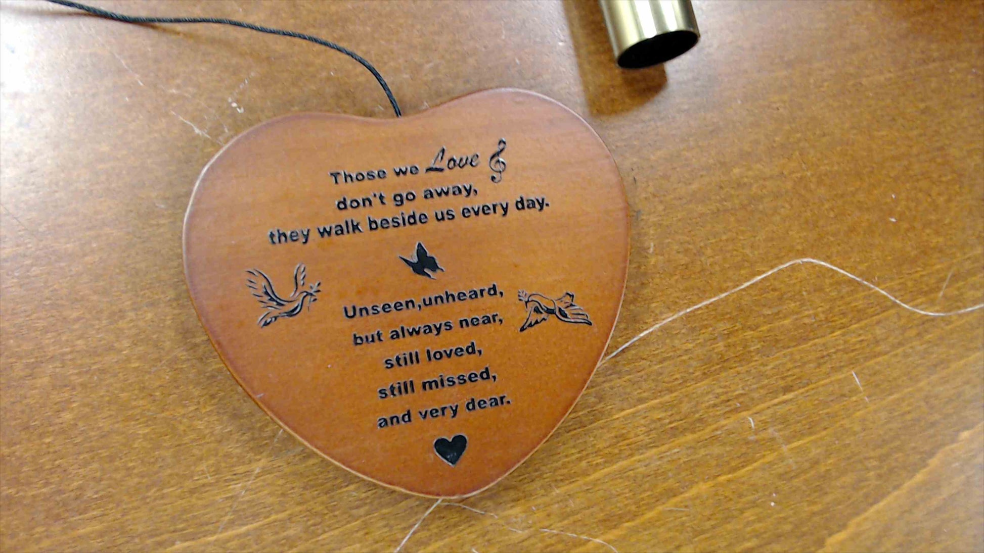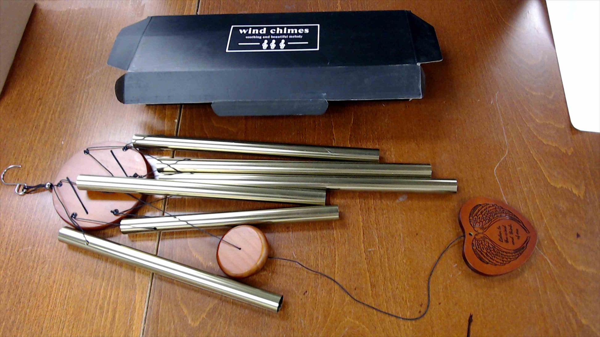 This new-in-box wind chime set features golden metal tubes with a wooden sail engraved with angel wings and the heartfelt message “Listen to the wind and think of me”. The reverse side reads: