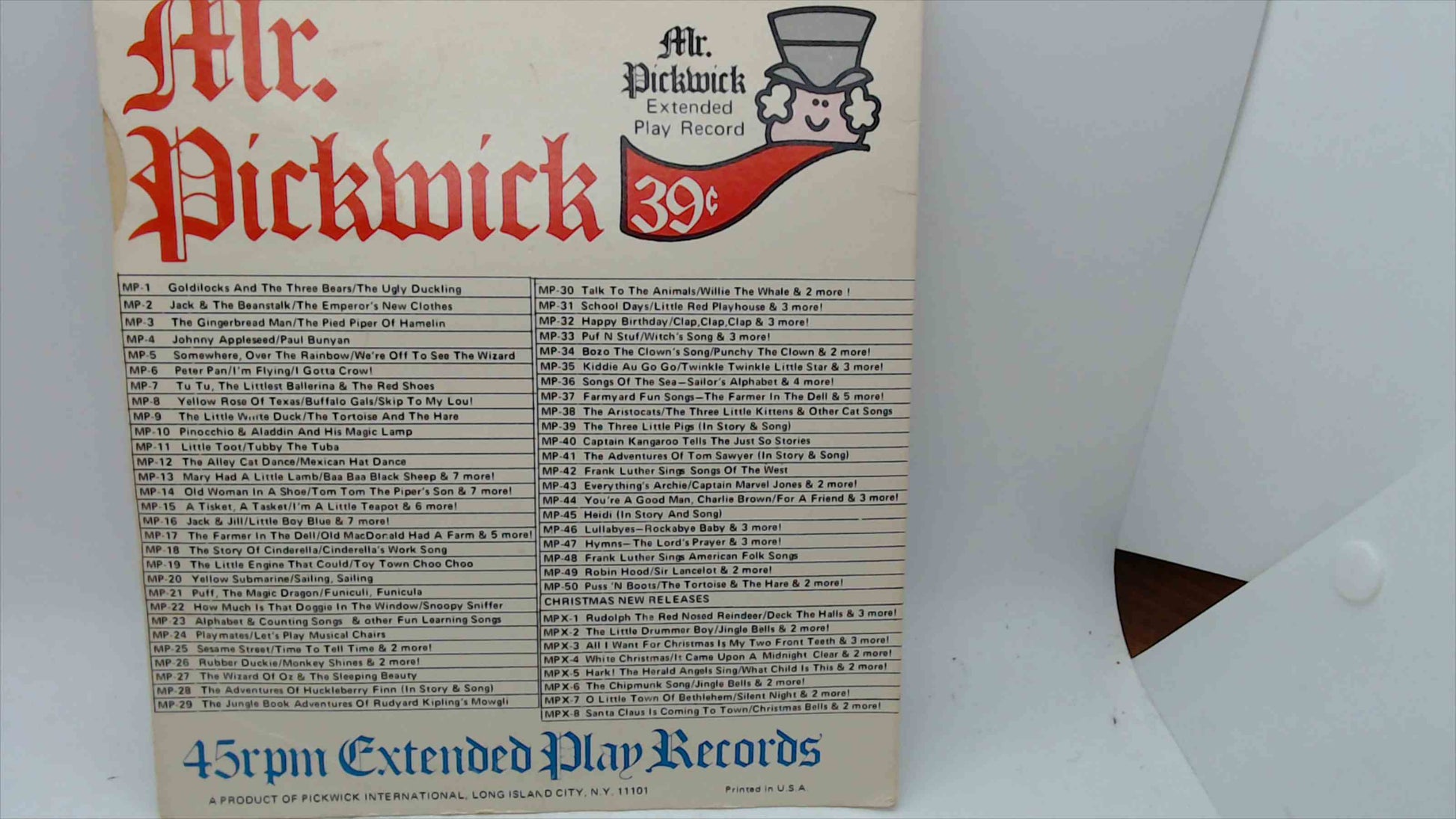Vintage children’s 7" 45 RPM extended-play record from Mr. Pickwick. Catalog MP-30. Includes the original picture sleeve with printed 39¢ price.