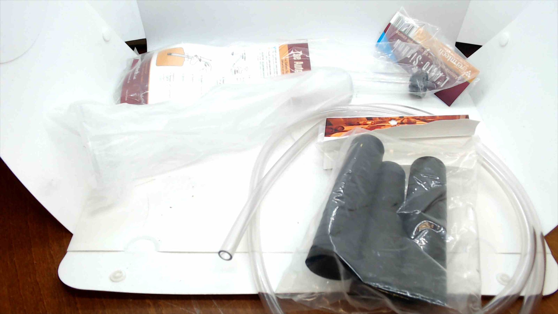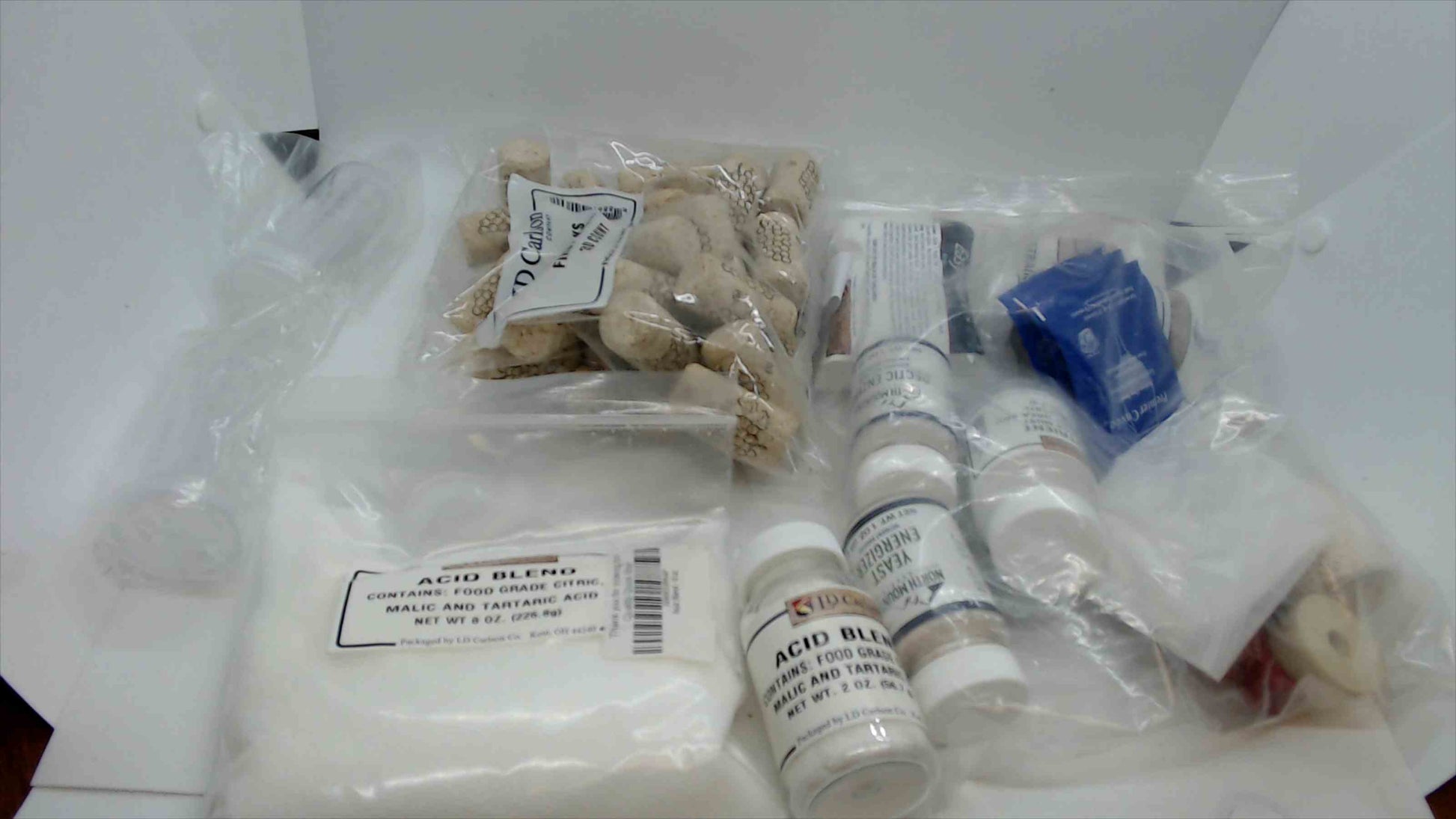 Everything you need to make small-batch fruit wine at home. Kit includes 1-gal glass carboy, 2-gal fermenter bucket with lid, autosiphon + 5/16" hose & clamp, bottle filler, hydrometer with test jar & wine thief, airlocks/bungs, double-lever corker, ~30 #8 corks with shrink caps, and a full set of additives (acid blend, pectic enzyme, tannin, Campden tablets, yeast nutrient/energizer, yeast packets, etc.) plus the Winemaker’s Recipe Handbook. Contents match the included checklist (see photos); most consumables are factory-sealed. Light shelf/box wear from storage.