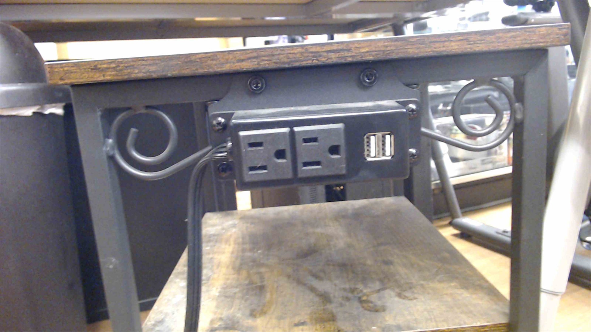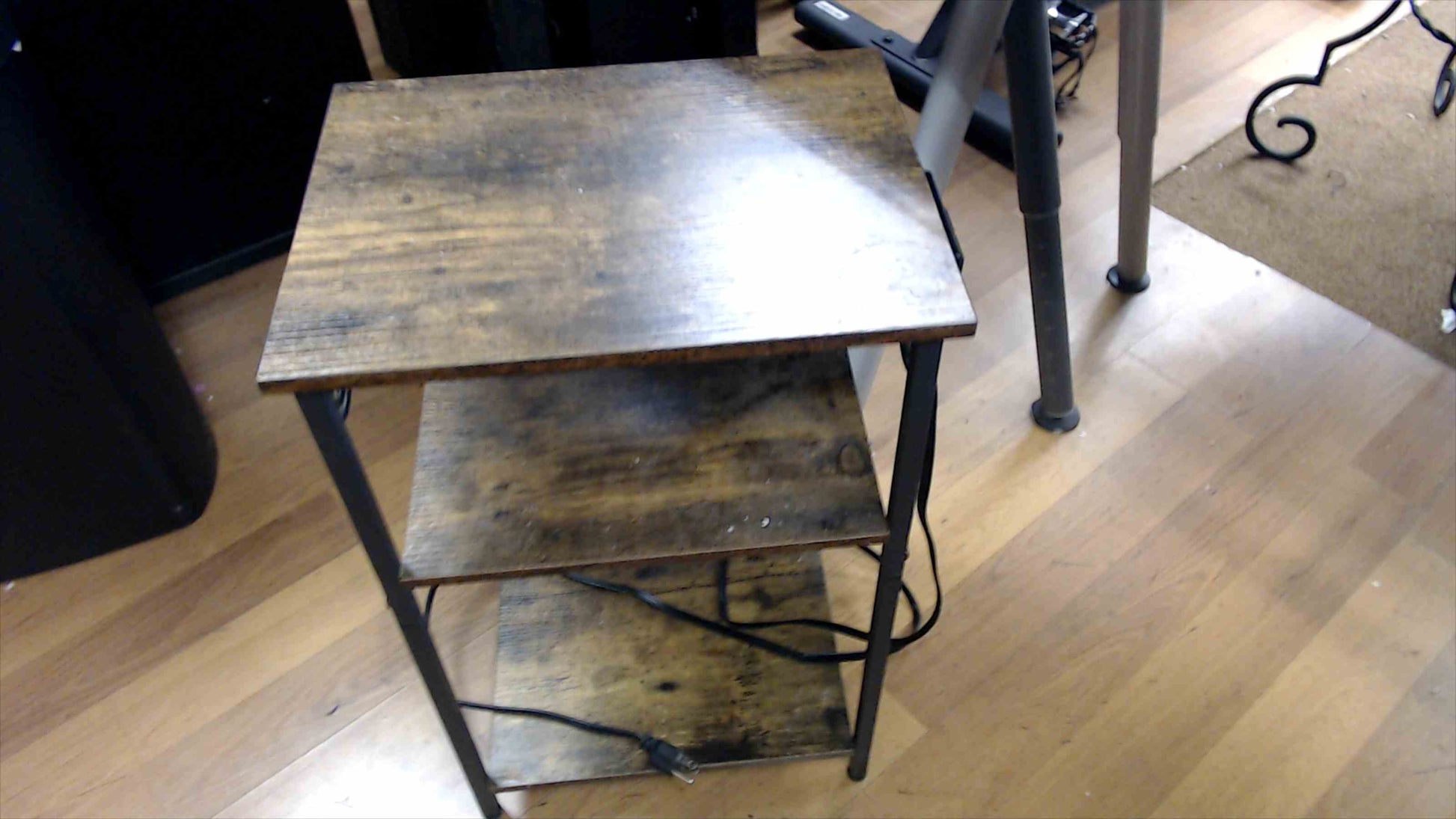 Compact side table featuring a warm, distressed wood top and shelves on a sturdy black metal frame with scroll accents. Under-mounted power hub includes two AC outlets and two USB charging ports with the attached cord—perfect for a sofa-side charging station or a small bedside table. Three shelves offer handy storage/display space. Preowned with light cosmetic wear from use (adds to the rustic look); solid and ready to plug in. See photos for details.