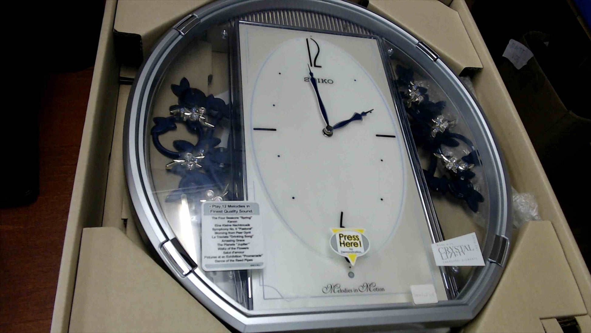 This Seiko "Melodies in Motion" wall clock features a modern oval face with elegant silver-tone framing and Swarovski crystal accents. Plays 12 high-quality melodies including classical pieces like The Four Seasons, Blue Danube Waltz, and Waltz of the Flowers. The decorative pendulum with floral accents adds charm to any room. Includes volume control, demonstration button, and light sensor that turns off music in darkness.