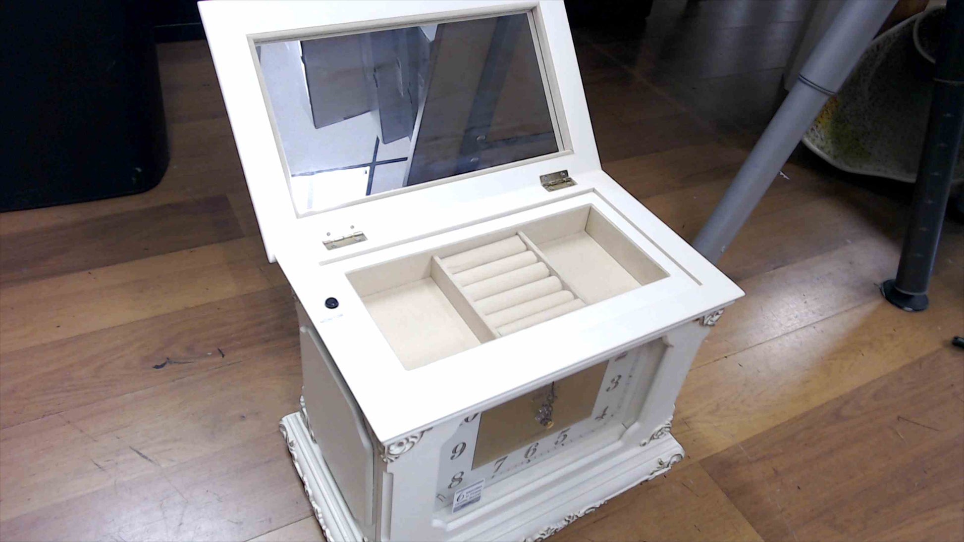 This elegant Seiko mantel clock combines timeless design with practical functionality. Finished in a vintage-inspired white with ornate detailing, this clock features a classic Roman numeral dial and plays 6 high-quality melodies. The unique design includes a hinged top that opens to reveal a built-in jewelry storage compartment with ring rolls and divided sections, complete with a mirror inside the lid. Perfect as both a decorative timepiece and a storage solution.