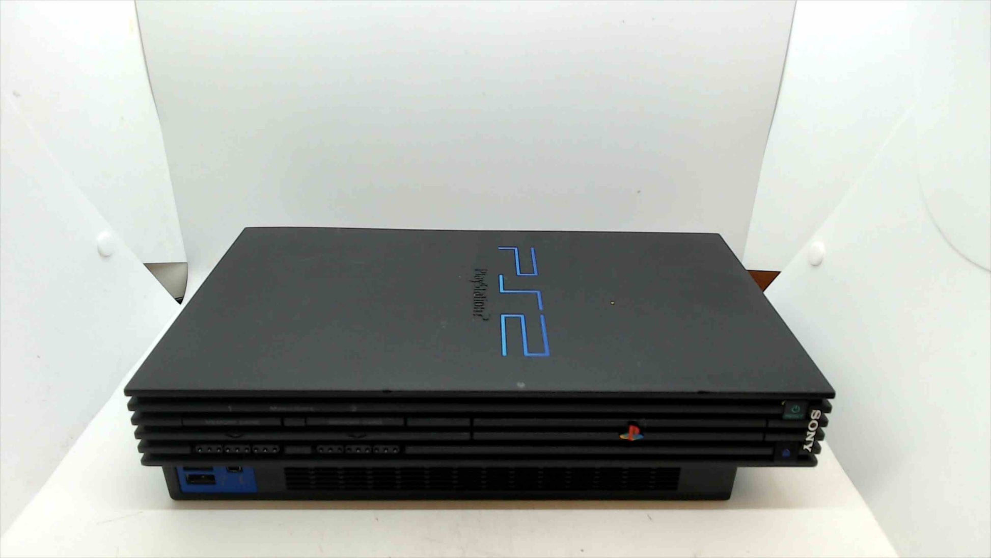 his is a Sony PlayStation 2 (PS2) Fat Console, the original launch model released in 2000. It features a black rectangular design with the vertical/stacked front panel and the signature blue “PS2” logo on top. The console supports both PlayStation 2 and original PlayStation 1 game discs, as well as DVD playback. It includes two controller ports, two memory card slots, and front USB ports
