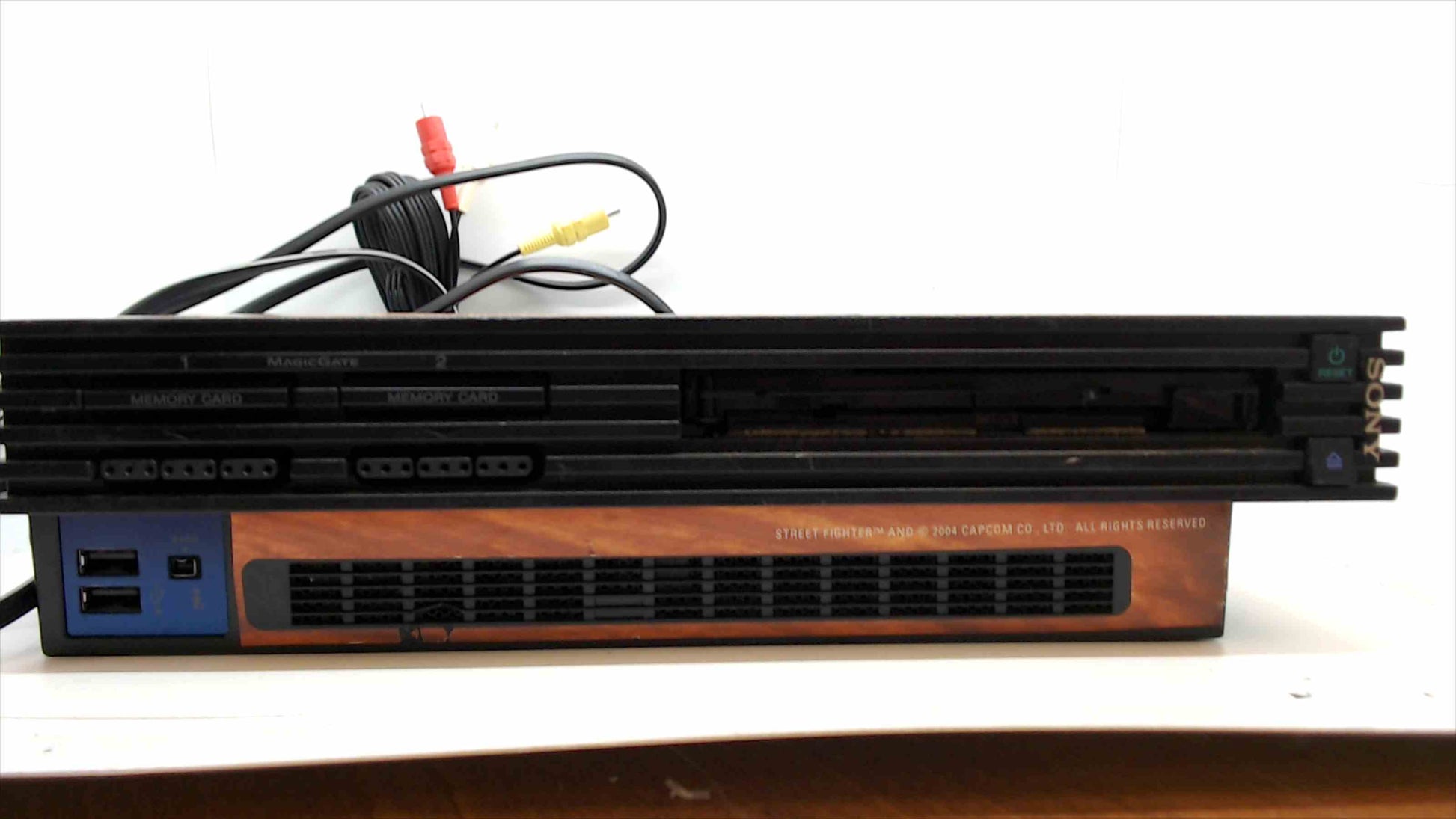 Rare Street Fighter 15th Anniversary Edition PlayStation 2 (PS2) console by Sony, featuring custom Ken artwork and exclusive branding. This limited edition console is fully tested and working. Includes an official Sony DualShock 2 wired controller, AV cables, and power cord for immediate play.