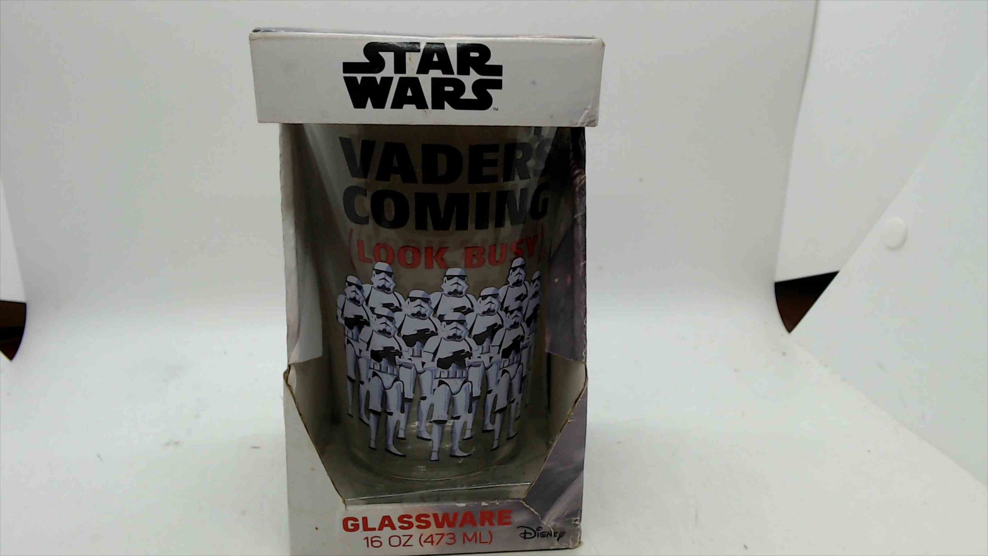 Official Disney/Lucasfilm 16 oz (473 ml) glass tumbler featuring Stormtroopers with the caption “Vader’s Coming (LOOK BUSY).” Produced by Silver Buffalo (model SW136266B). Glass is unused; box shows noticeable shelf/storage wear and small tears from handling. Hand-wash/top rack only; not microwave safe; recommended age 14+. Great for Star Wars fans or display in a collection.