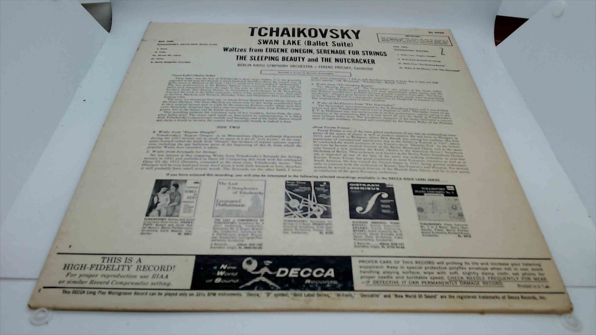 Immerse yourself in timeless ballet masterpieces with this vintage Tchaikovsky LP featuring the Swan Lake Ballet Suite and famous waltzes from Eugene Onegin, The Sleeping Beauty, and The Nutcracker. Performed by the Berlin Radio Symphony Orchestra and conducted by Ferenc Fricsay, this Decca Gold Label Series pressing offers a rich listening experience. The vinyl is in excellent condition with only minor cosmetic signs of age on the outer sleeve.