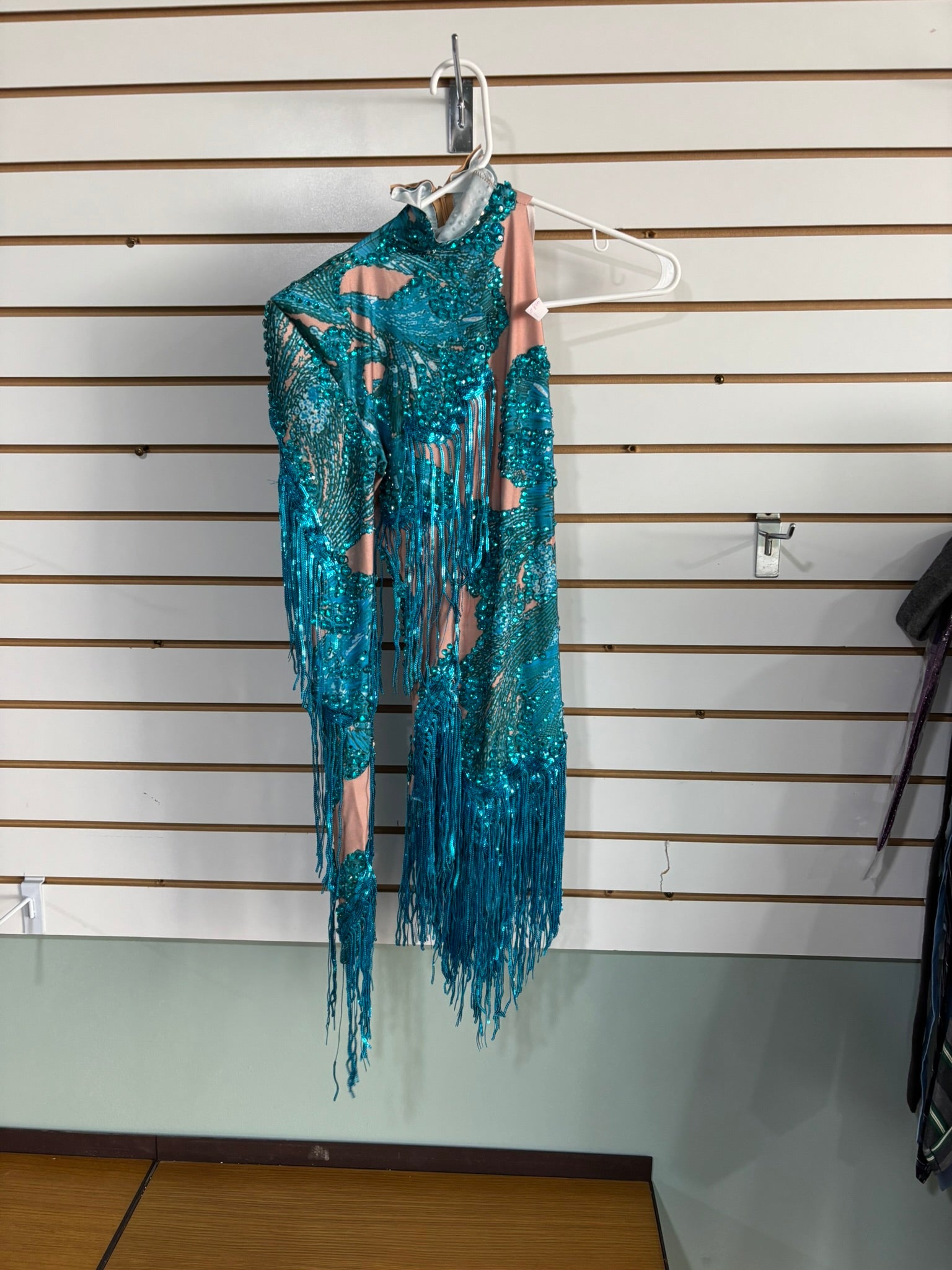 Turquoise Sequin Fringe Latin Dance Dress – One Sleeve