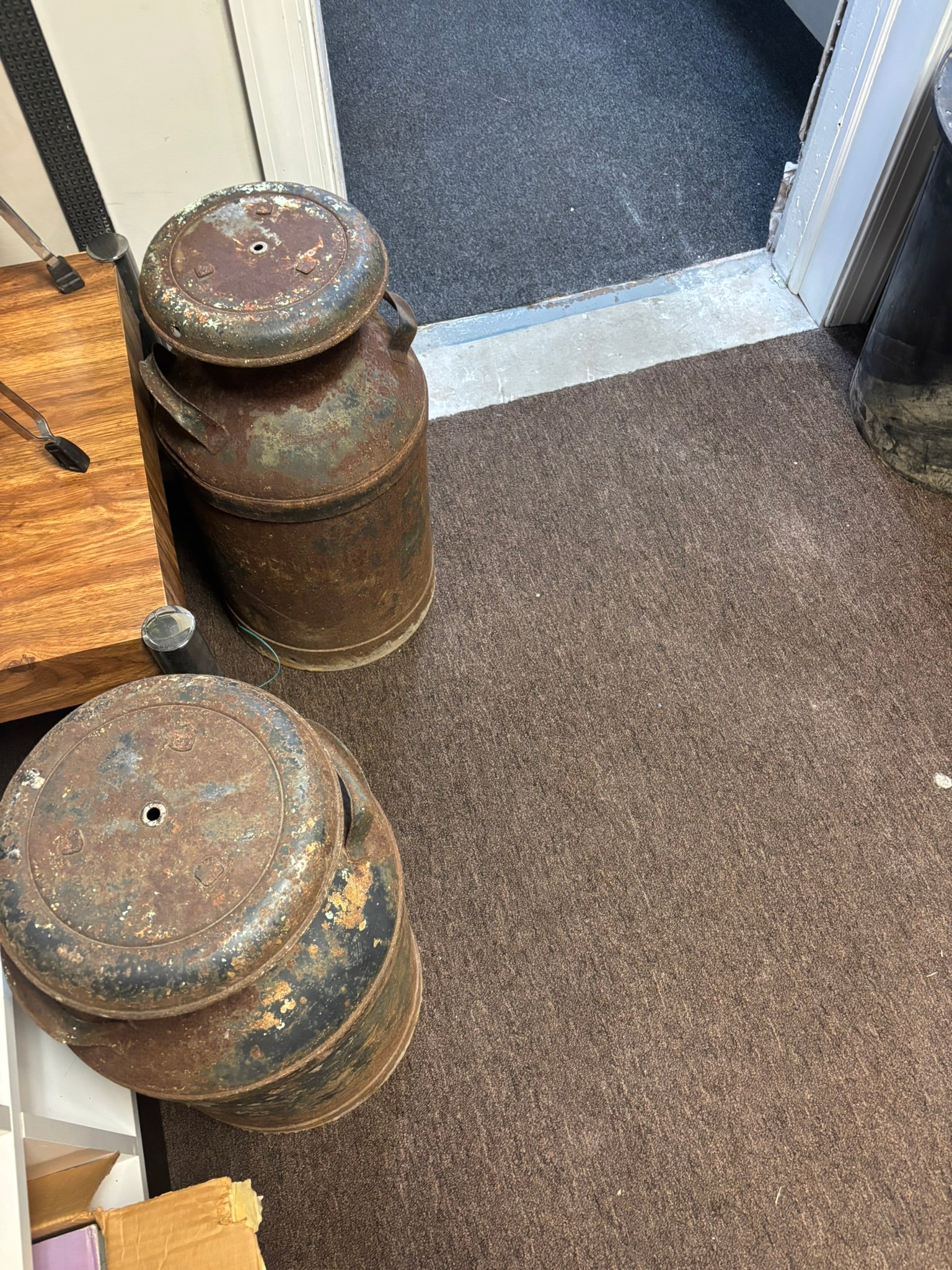 Authentic vintage milk jugs featuring weathered patina and classic farmhouse design. These functional collectibles showcase historical craftsmanship with their sturdy handles and distinctive pour spouts. Perfect as decorative accents or repurposed as rustic vases in country-inspired interiors. Each jug carries unique character marks from decades of use. Final sale. No returns excepted.
