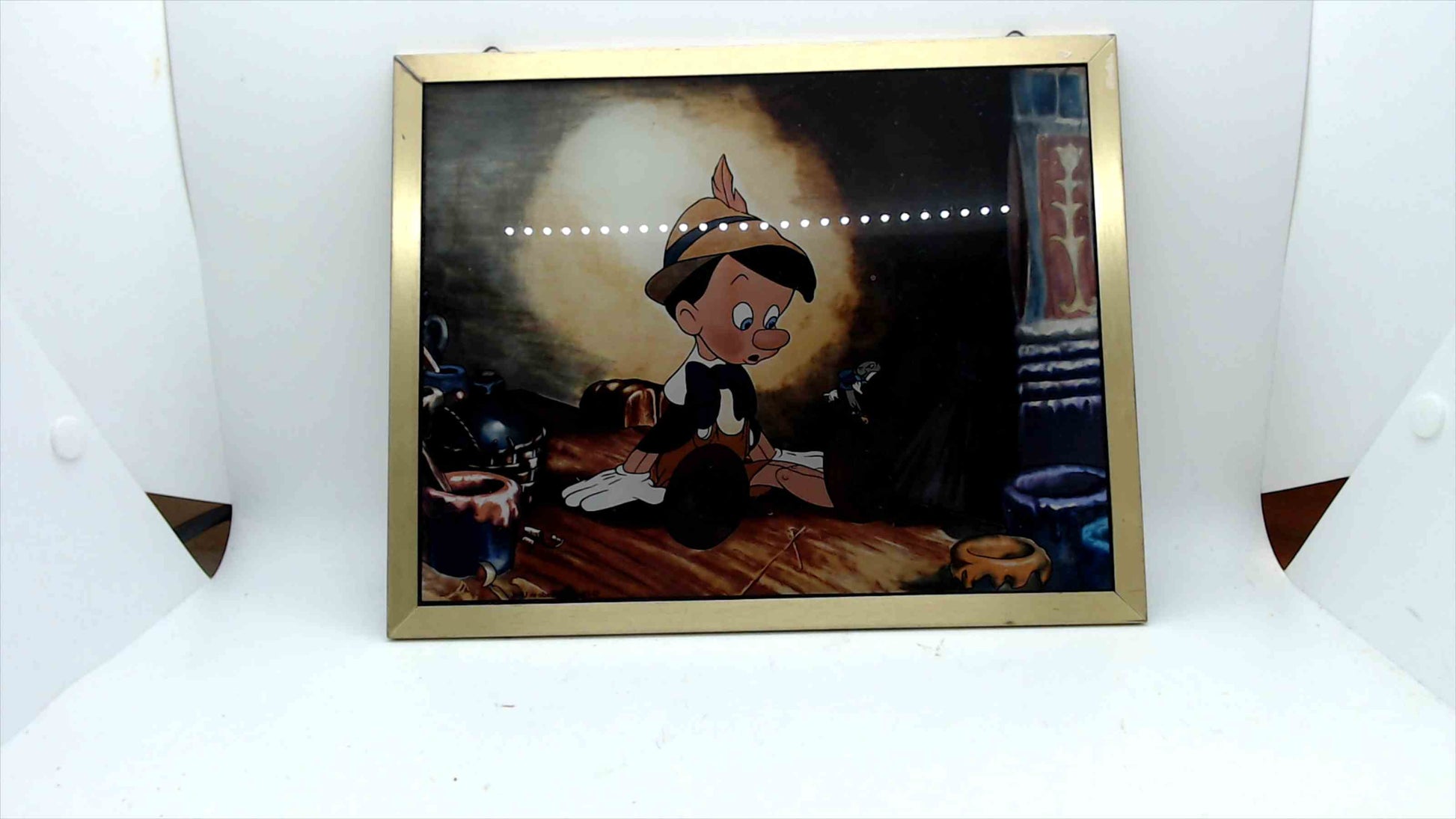 This charming vintage Disney collectible features Pinocchio and Jiminy Cricket in a vibrant, nostalgic animation scene. The image is set between two panes of glass, giving it a unique double-sided display. Encased in a sleek gold-tone frame, it captures the warmth and detail of classic Disney animation, making it a perfect addition for Disney collectors, animation art enthusiasts, or vintage décor lovers. Ready to hang and enjoy.
