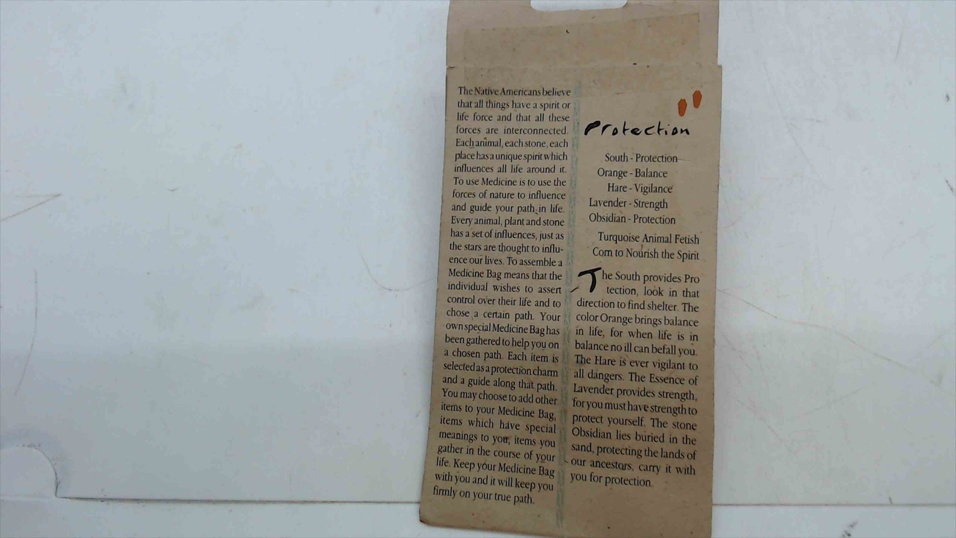 This is a vintage Medicine Bag titled “Protection”, crafted as a symbolic charm pouch representing Native American-inspired tradition. The pouch is made of faux leather and still sealed on its original card packaging. According to the insert, each bag contains seven medicine charms tied to themes of protection, balance, vigilance, strength, and nourishment.