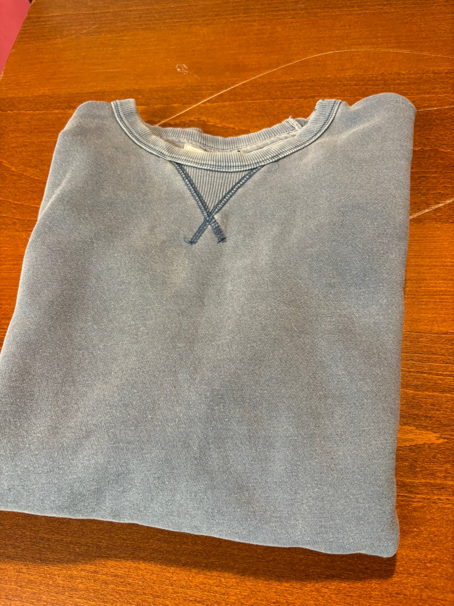 Vintage-Wash Crewneck Sweatshirt in Faded Indigo. With its relaxed fit, soft brushed fabric, and worn-in look, this piece delivers both comfort and timeless style. The classic V-stitch at the collar and raw-edge neckline add subtle vintage detailing that sets it apart from ordinary basics.