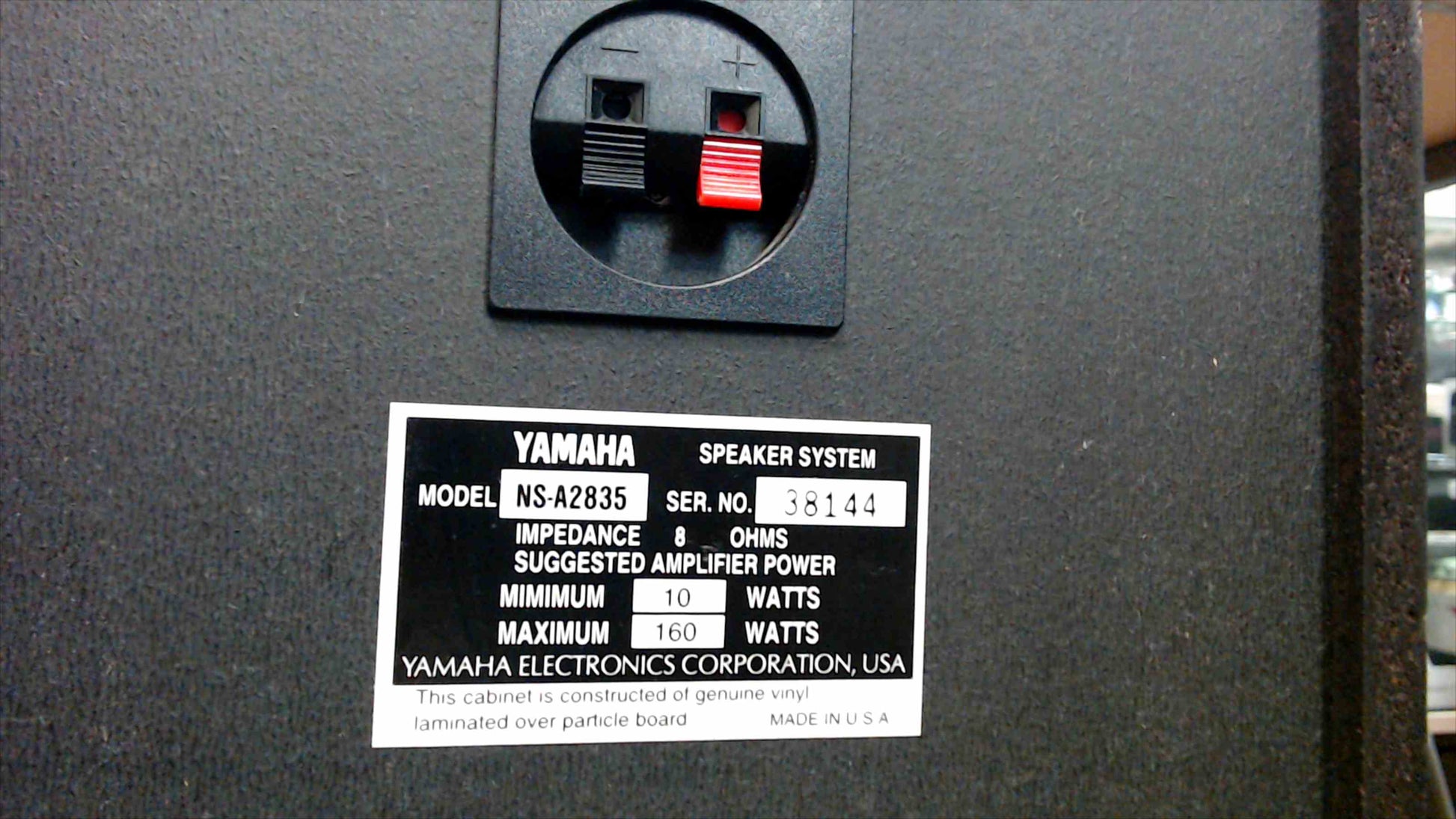 • Yamaha NS-A2835 floorstanding speakers (pair) — 8 ohms, suggested amp power 10–160W, spring-clip terminals, cloth grilles; normal cosmetic wear from use.